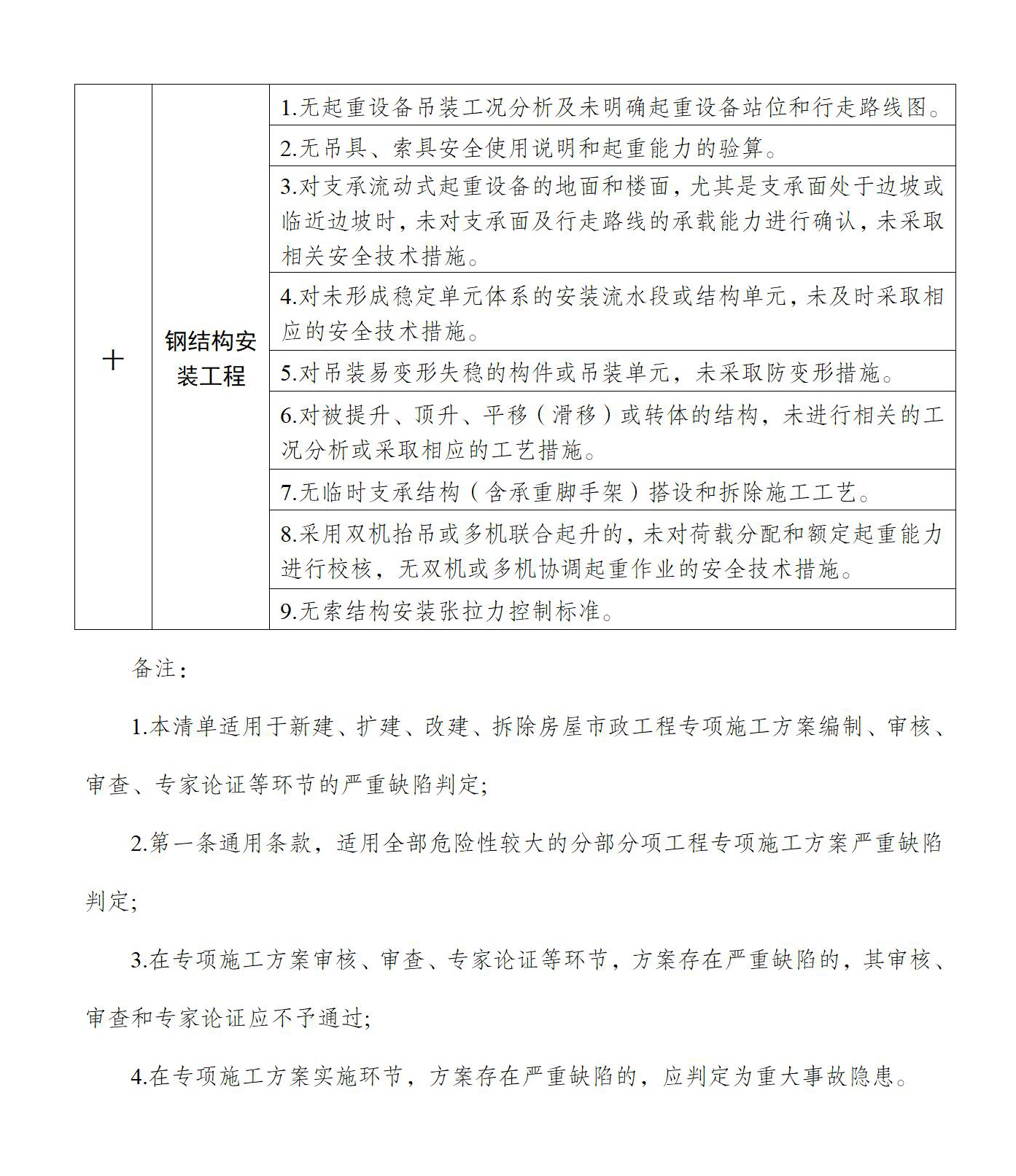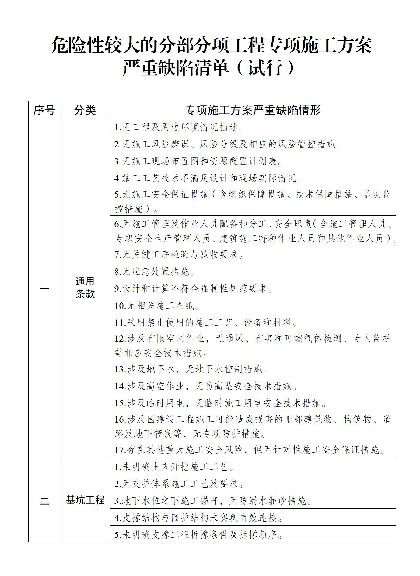 為進一步提高危險性較大的分部分項工程專項施工方案編制質(zhì)量,有效防范生產(chǎn)安全事故發(fā)生,結(jié)合施工安全實際,我部制定了《危險性較大的分部分項工程專項施工方案嚴重缺陷清單(試行)》。現(xiàn)印發(fā)給你們,請督促房屋市政工程各方責任主體嚴格執(zhí)行,從源頭提升建筑施工本質(zhì)安全水平。